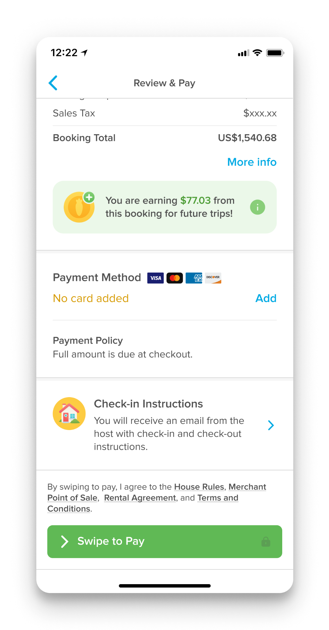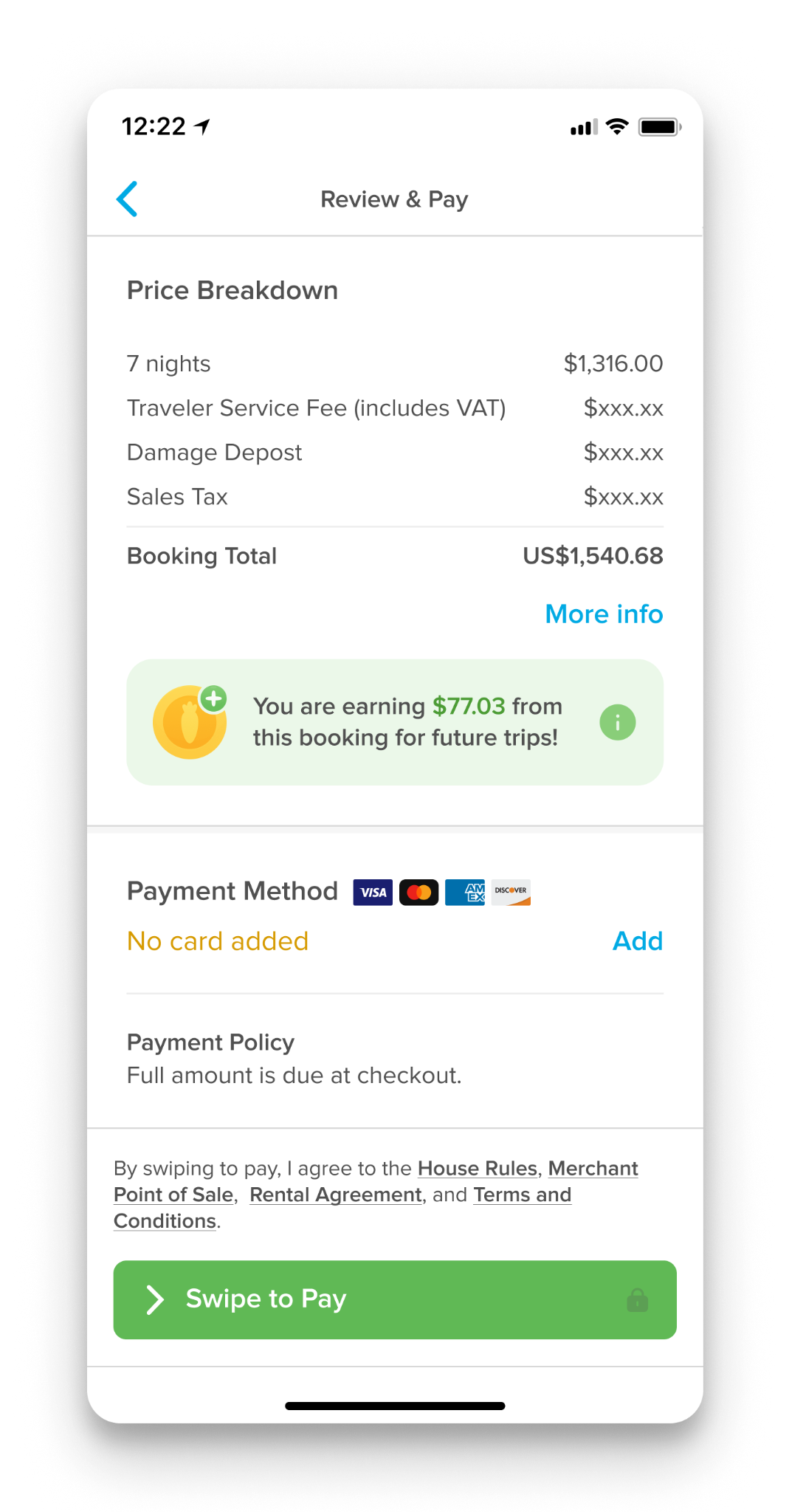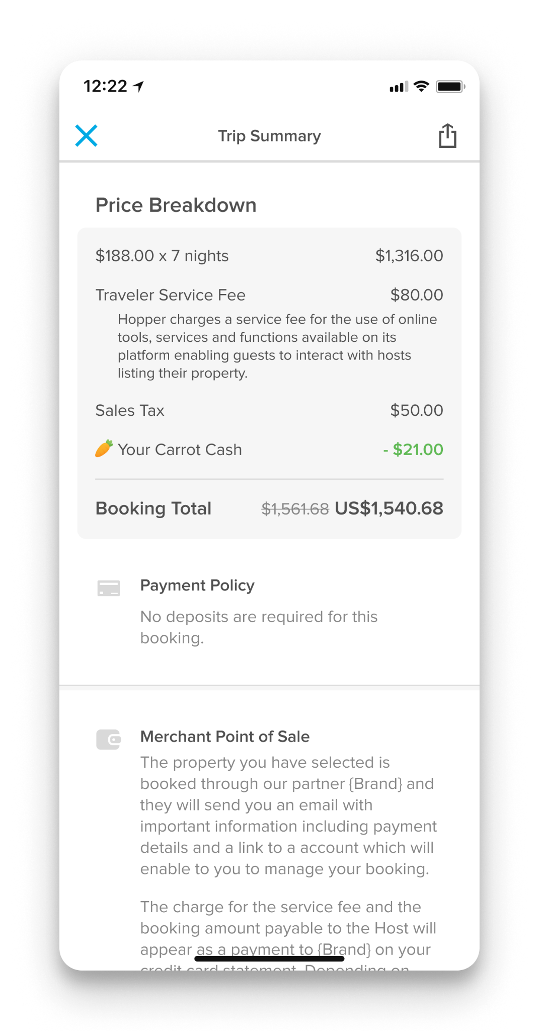 After various iterations, we landed on a checkout summary that balances transparency with simplicity. A Hopper banner reminds users that they earn rewards with every booking.