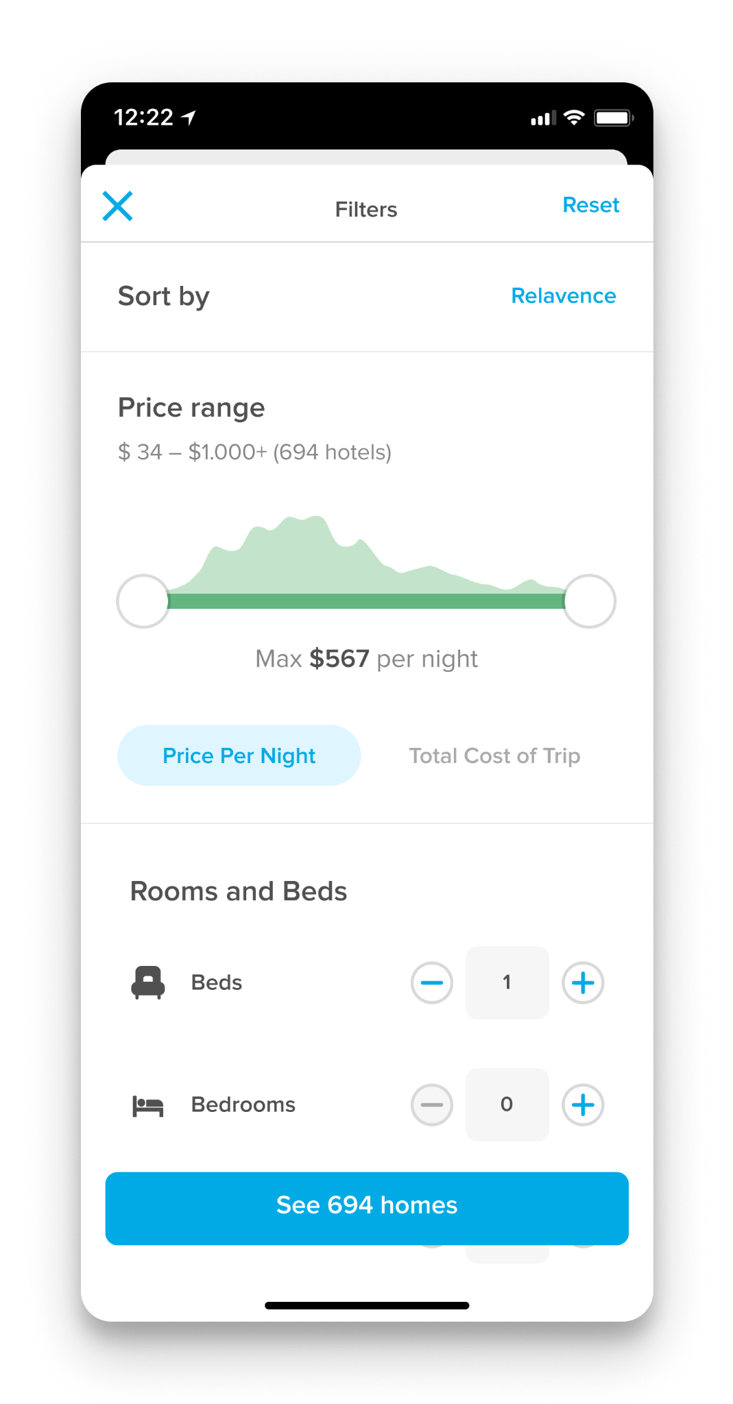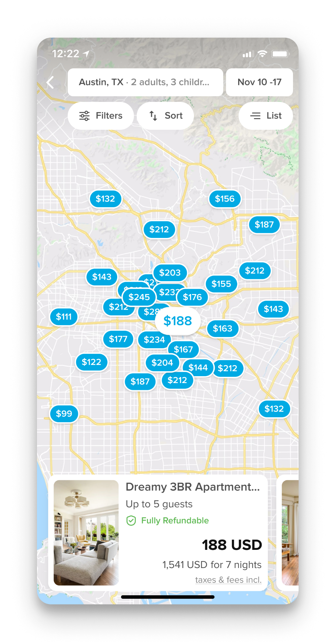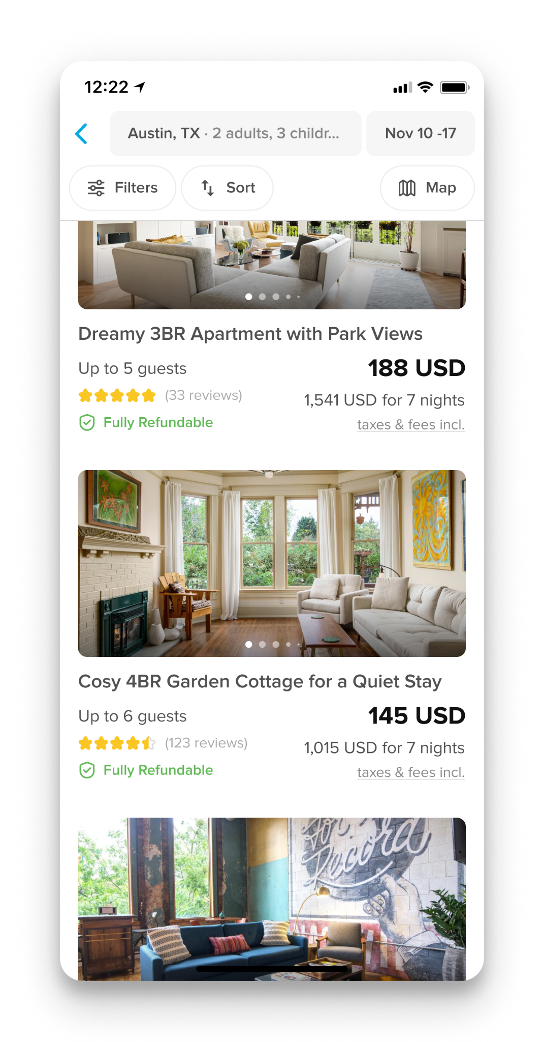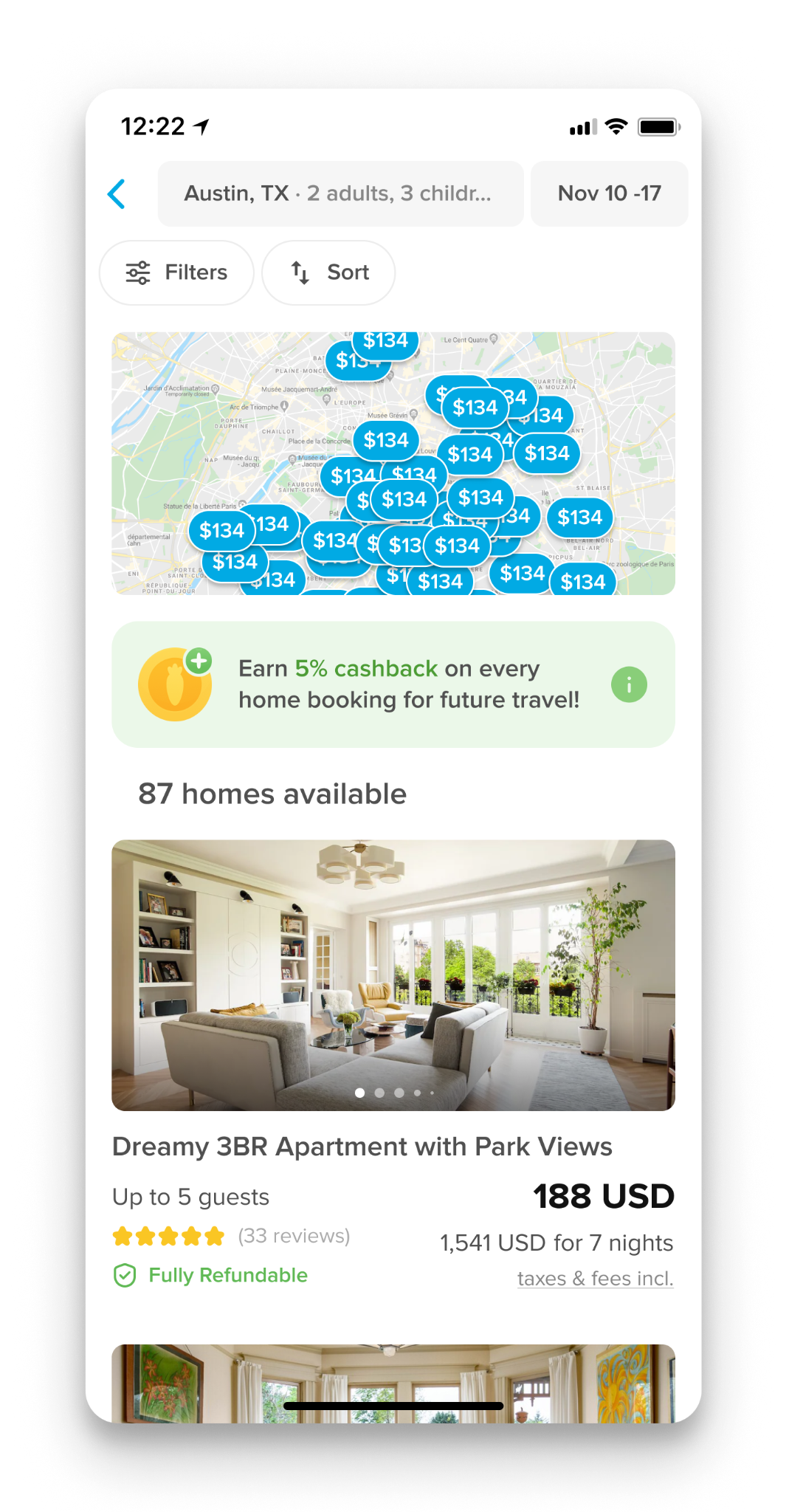Users browse search results from a list or map view. They can filter their results to match their preferences, such as price, rooms and beds, and amenities.