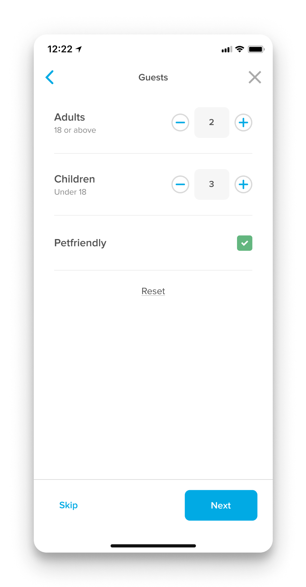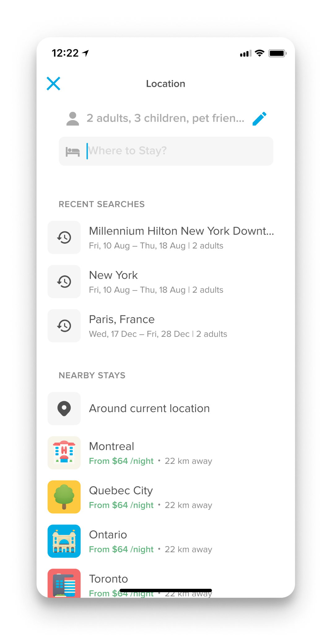 Users enter the search experience from the Hopper home screen. From there they can search by location, dates, and specify their guest count.