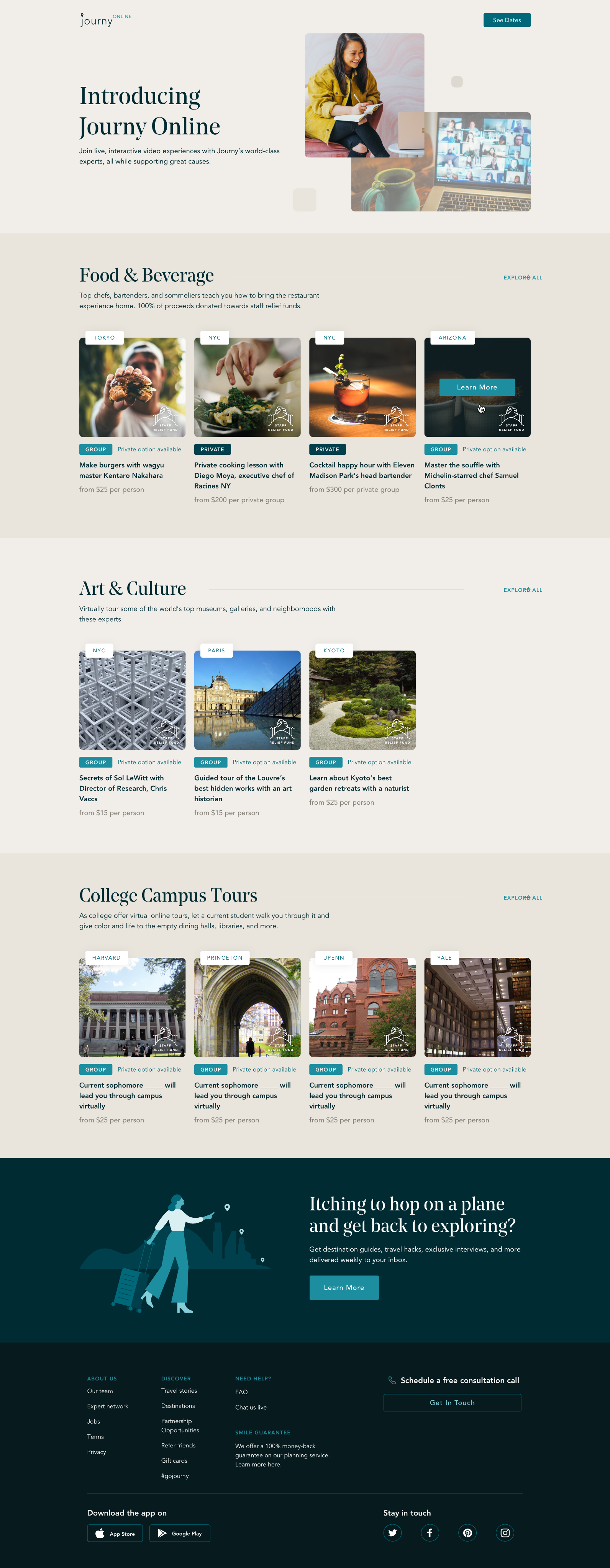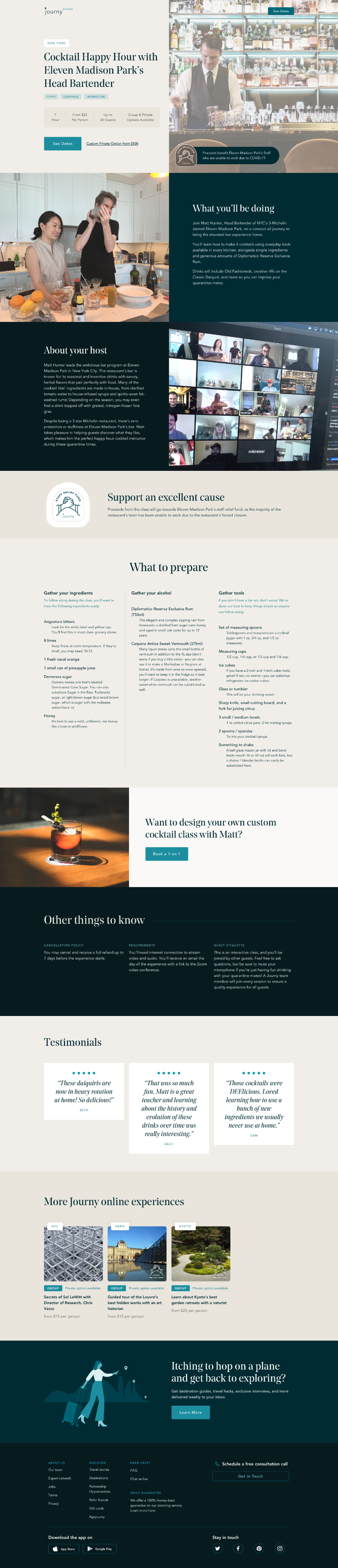 As the pandemic set in, Journy pivoted to offer bespoke, immersive online experiences that brought the spirit of travel home. From Michelin-star chef cooking classes to guided meditations, these curated events offered a way to reconnect with global culture safely and meaningfully. Proceeds supported the local experts who powered Journy’s trip itineraries, helping sustain the community that makes authentic travel possible.