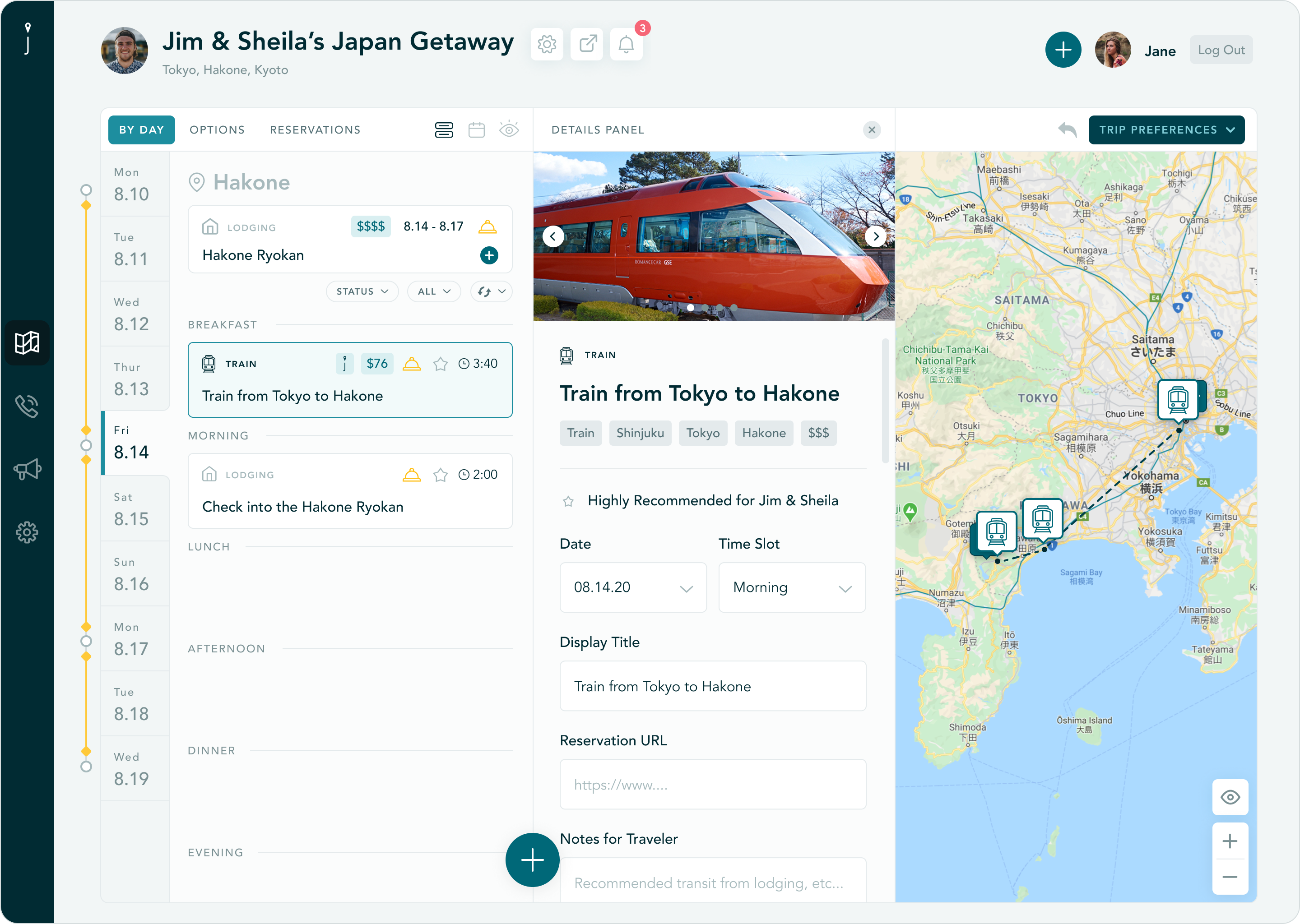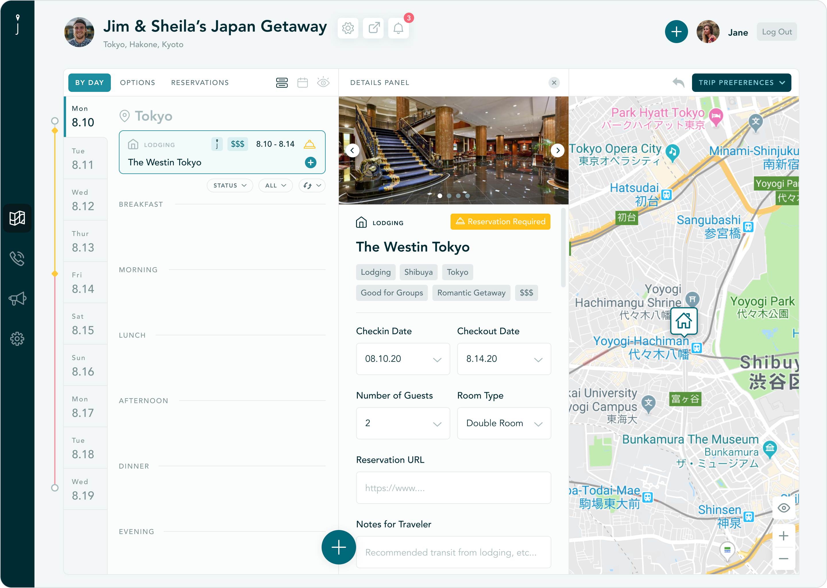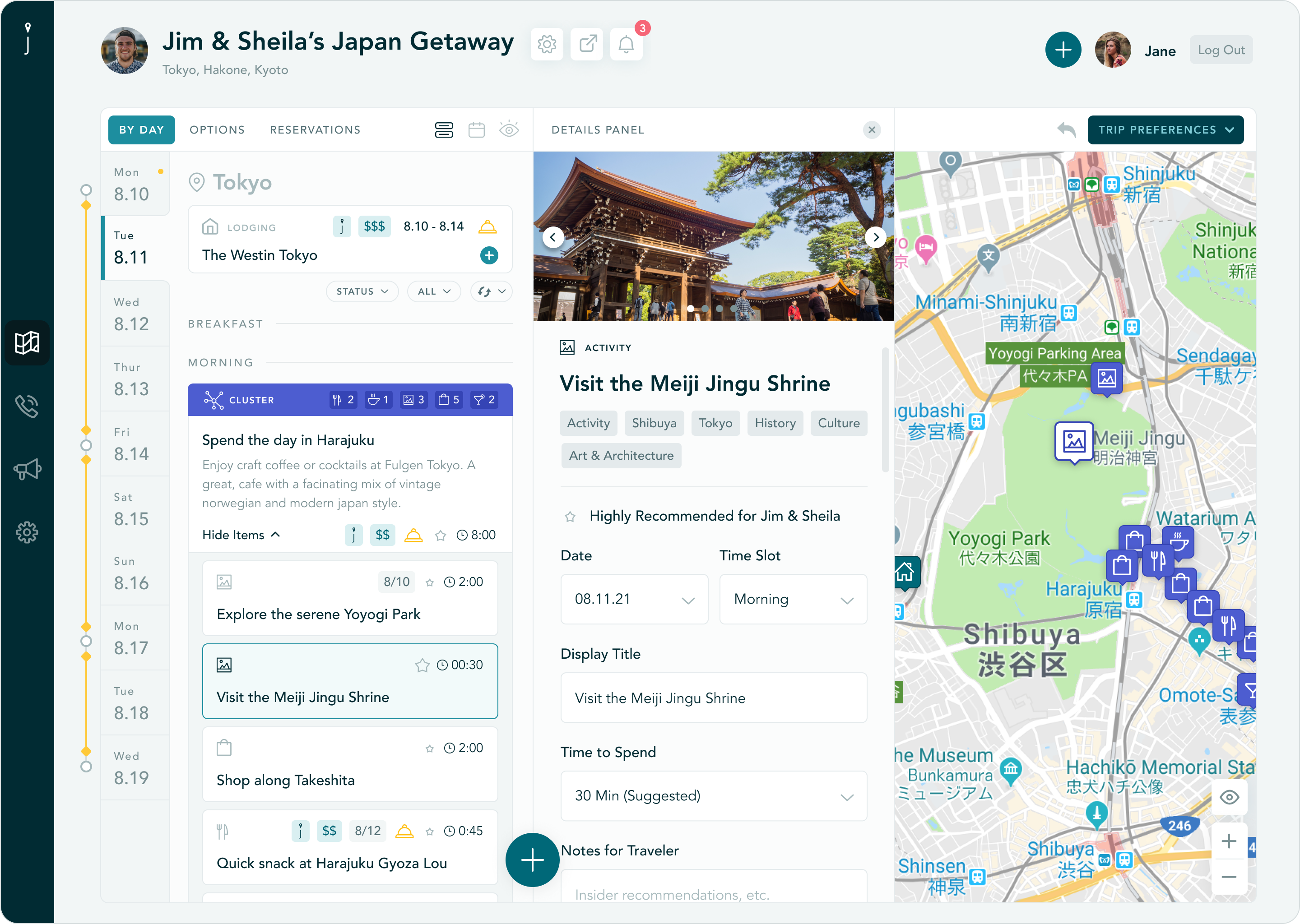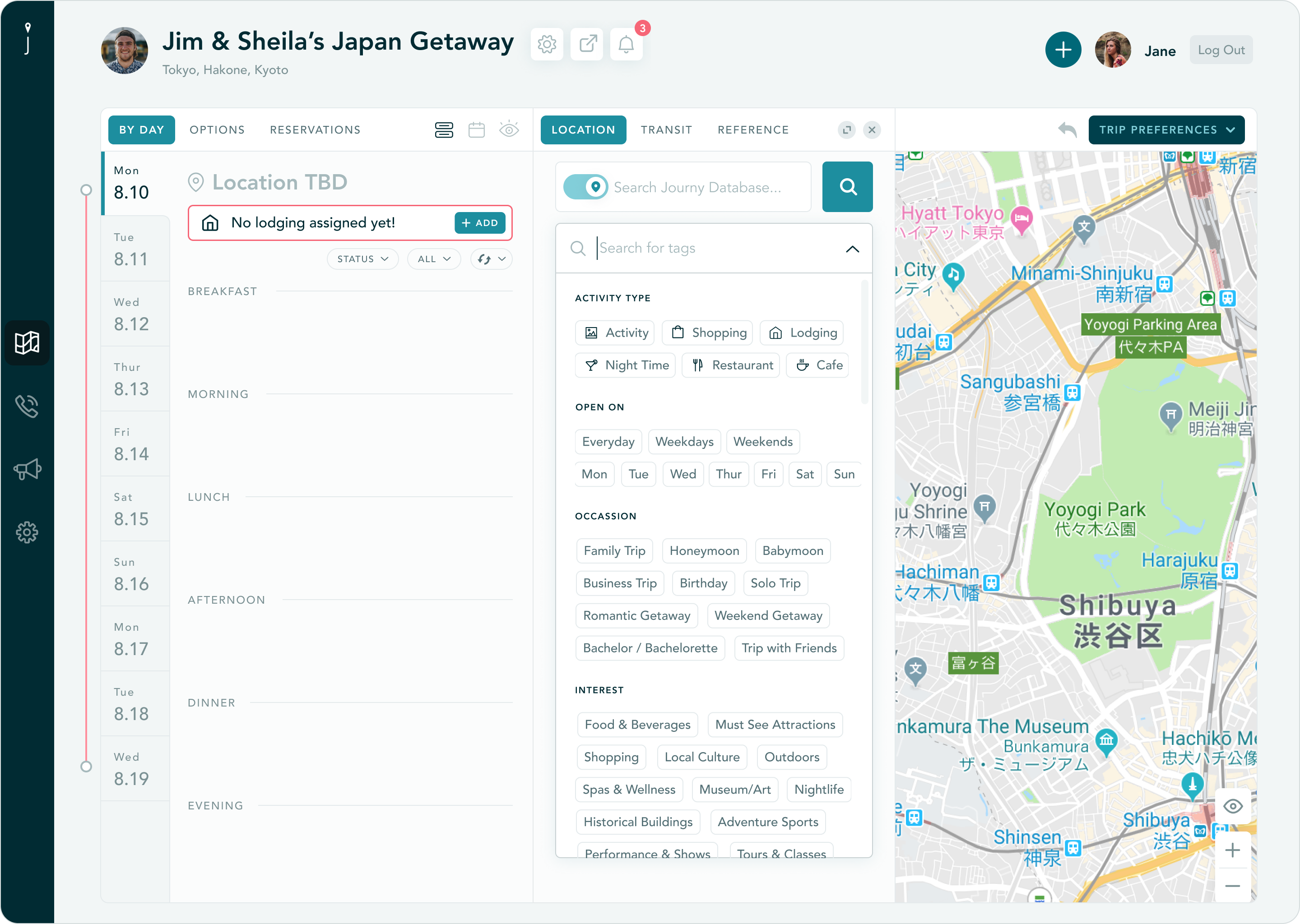 Trip designers enter the Journy platform and can immediately jump into a trip itinerary.