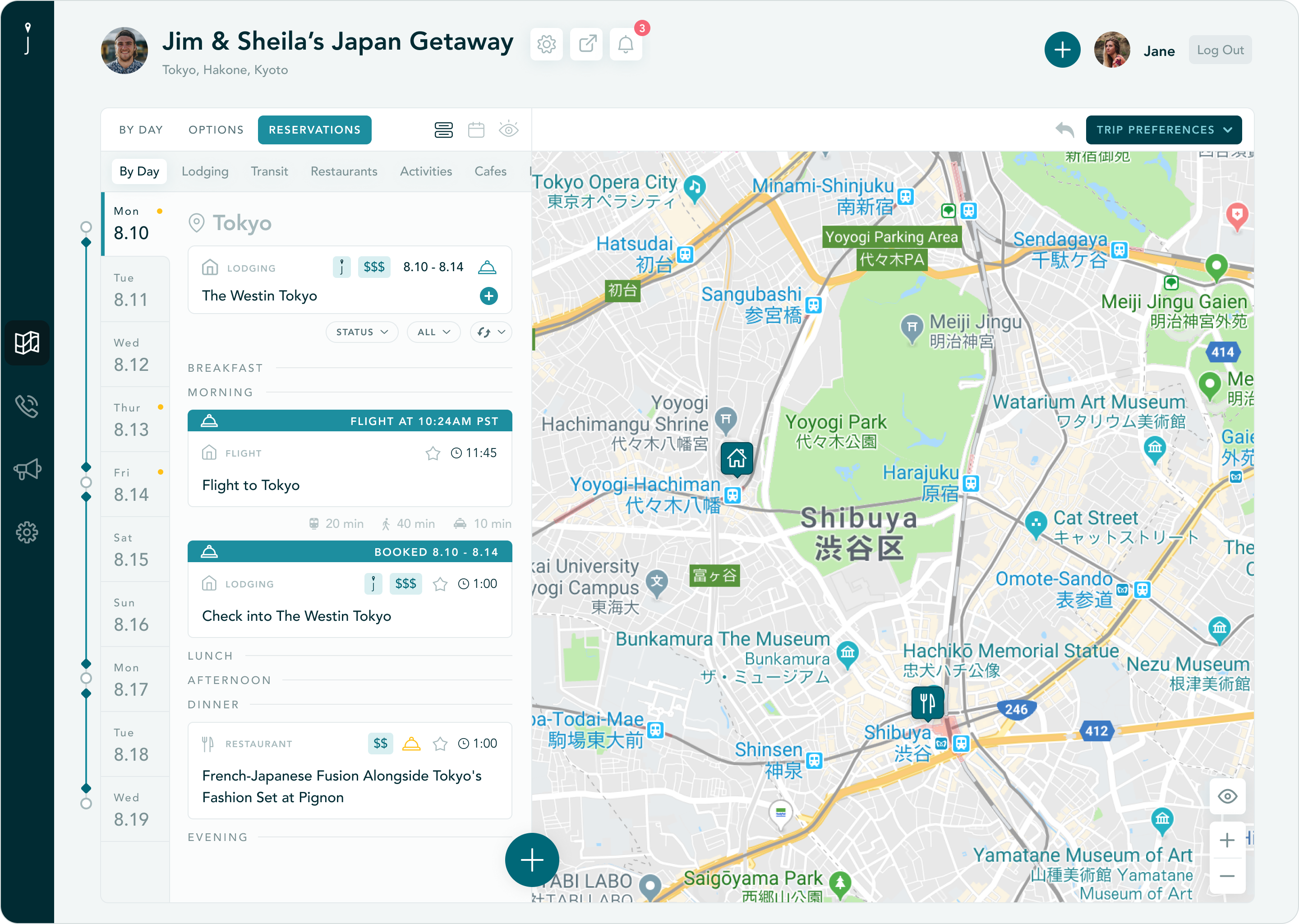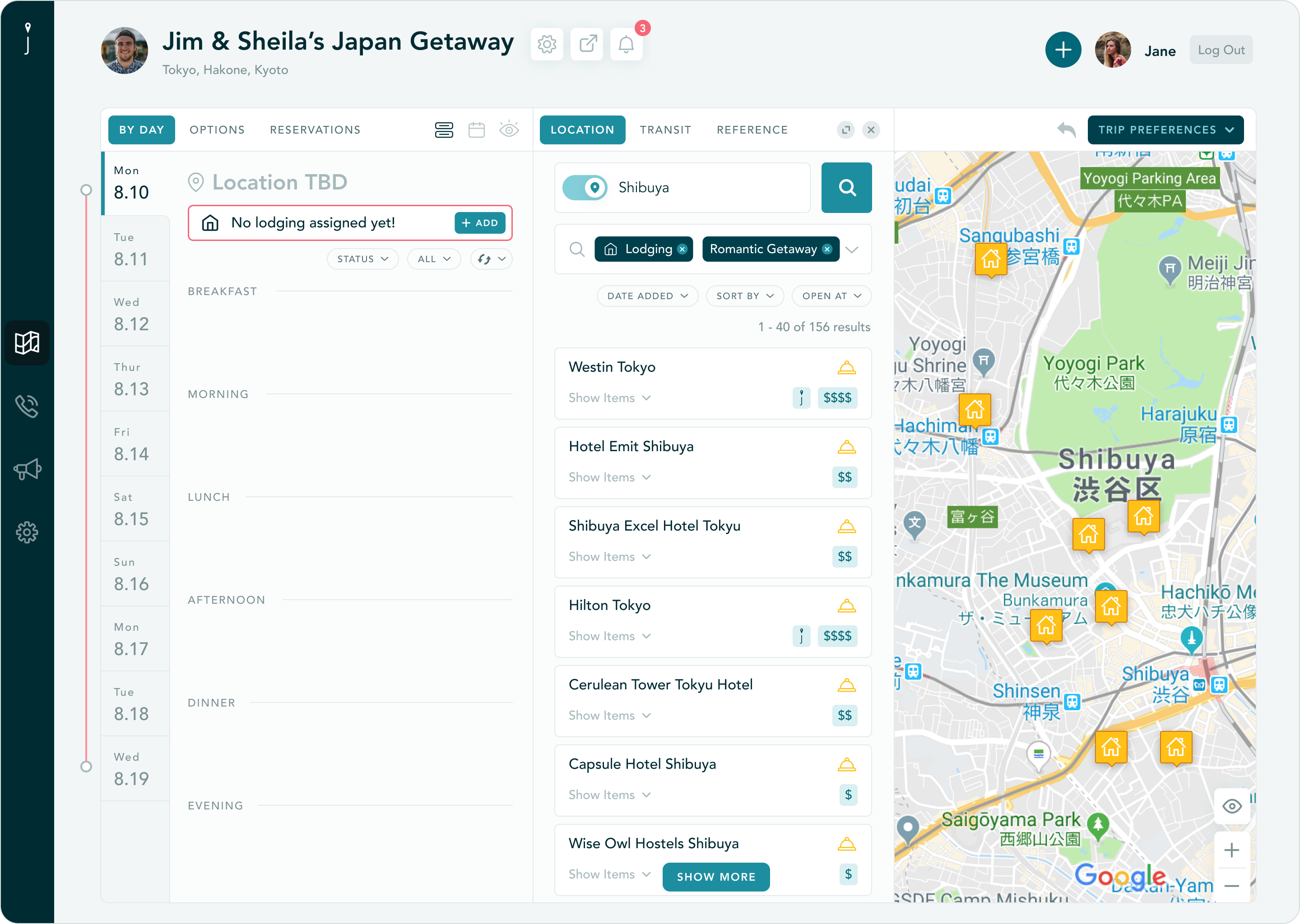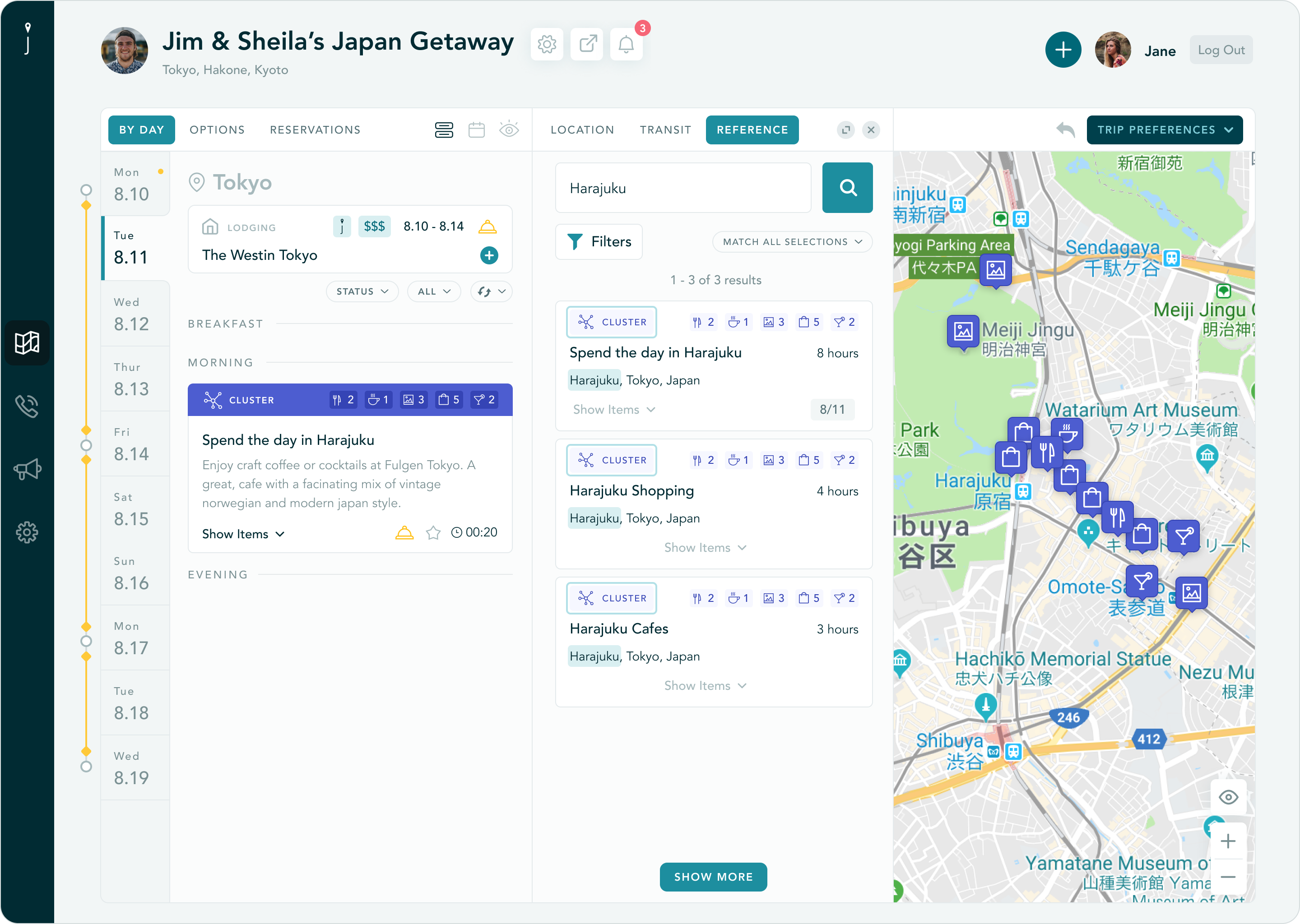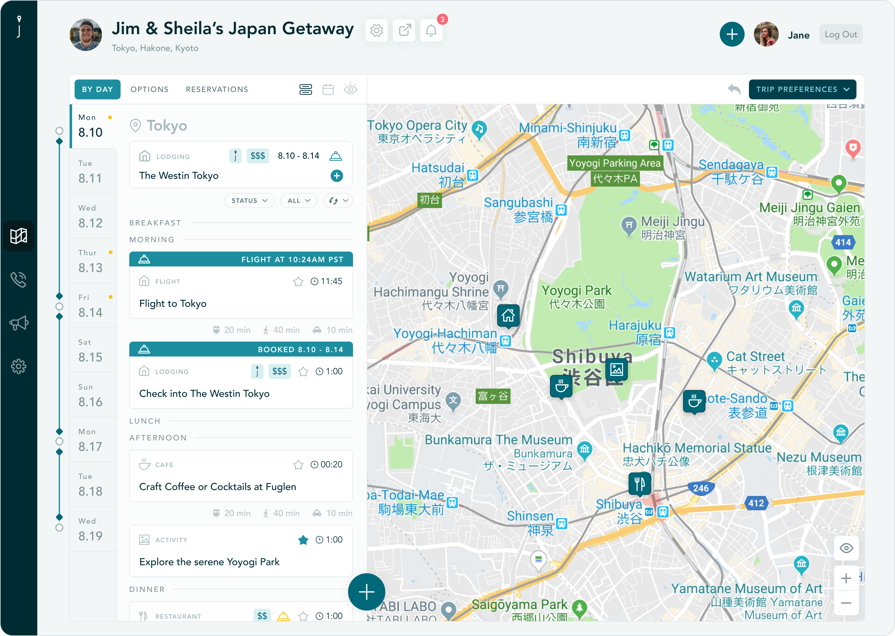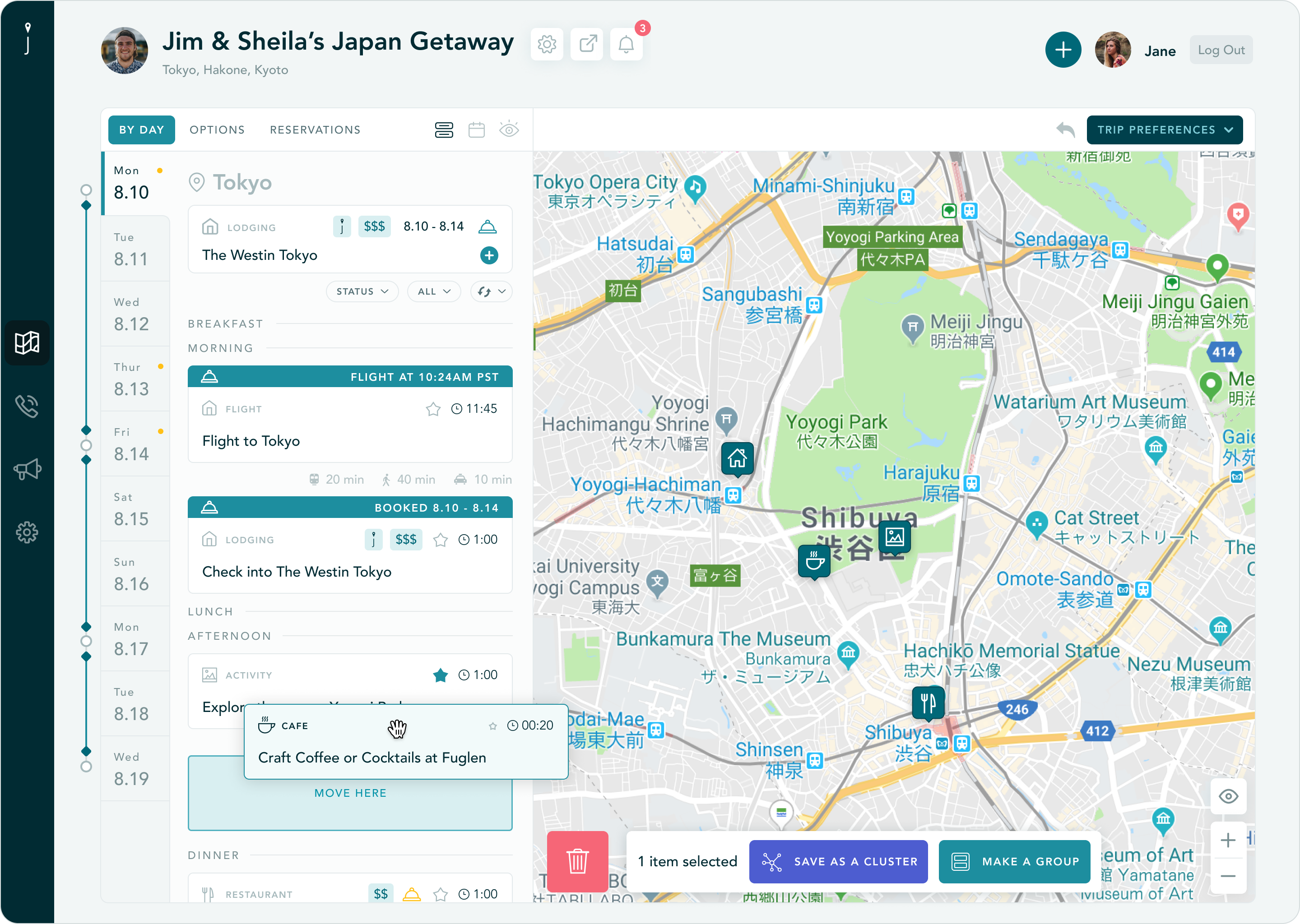 Trip designers enter the Journy platform and can immediately jump into a trip itinerary.