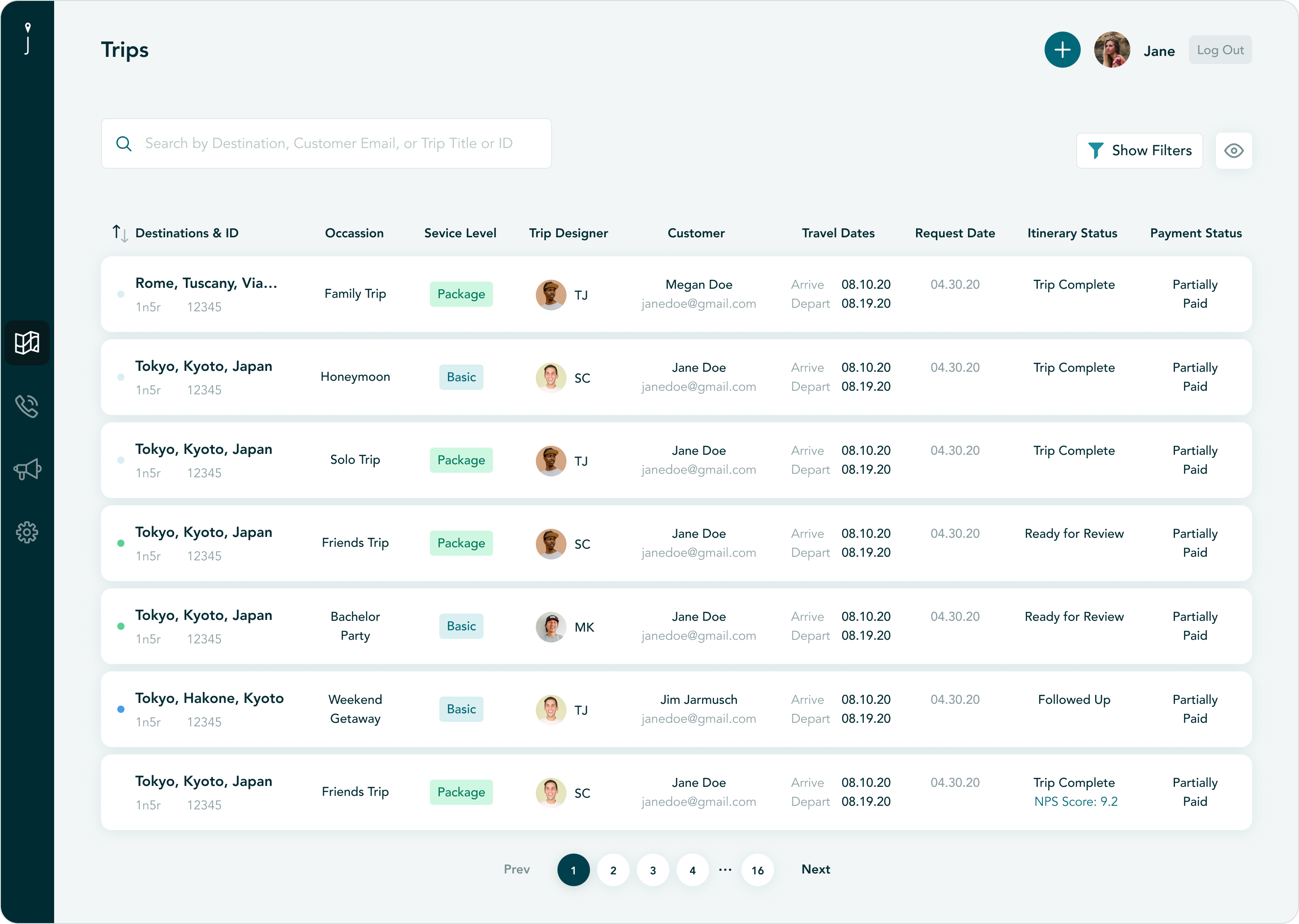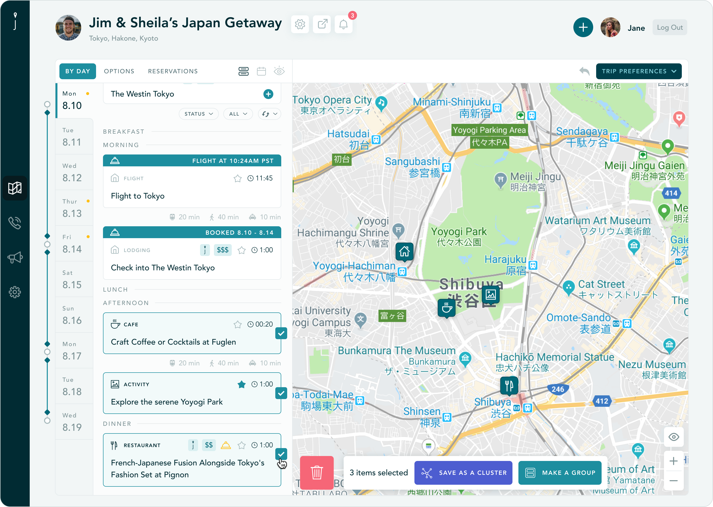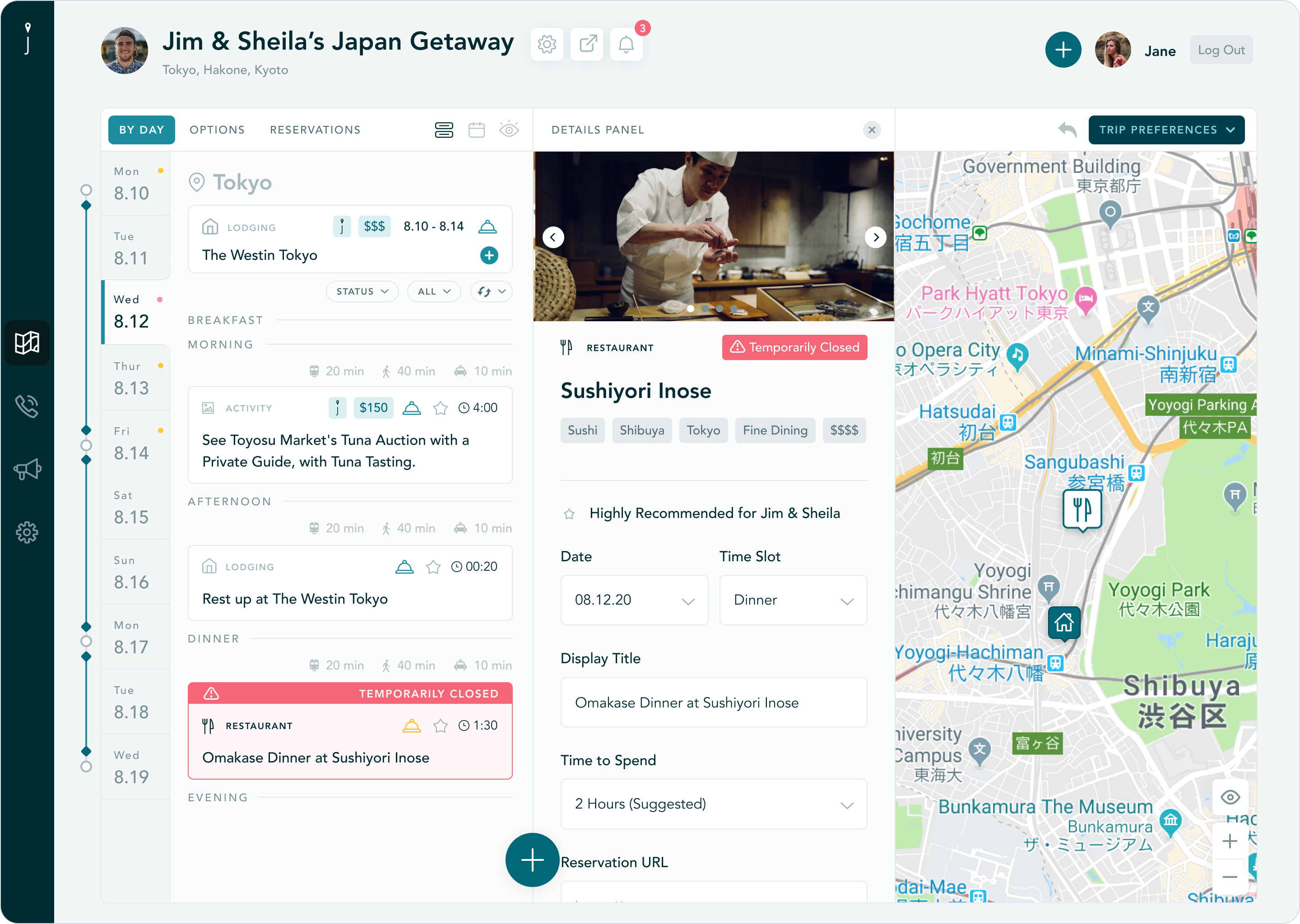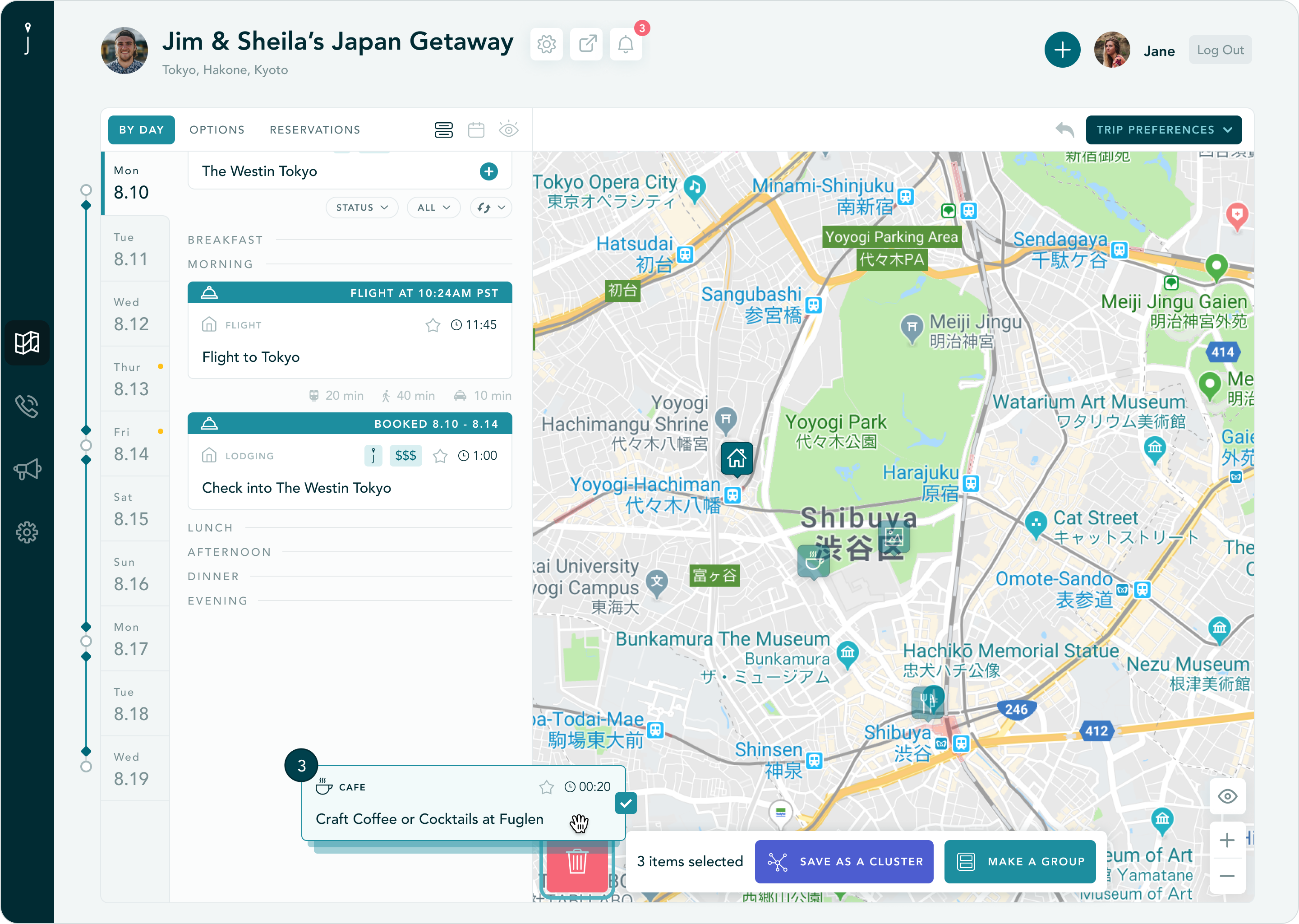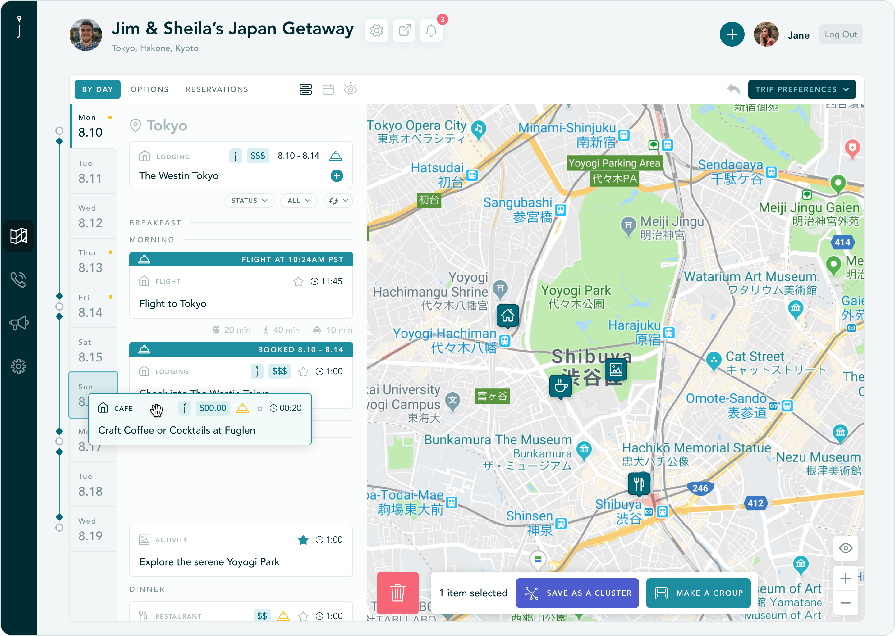 Trip designers enter the Journy platform and can immediately jump into a trip itinerary.